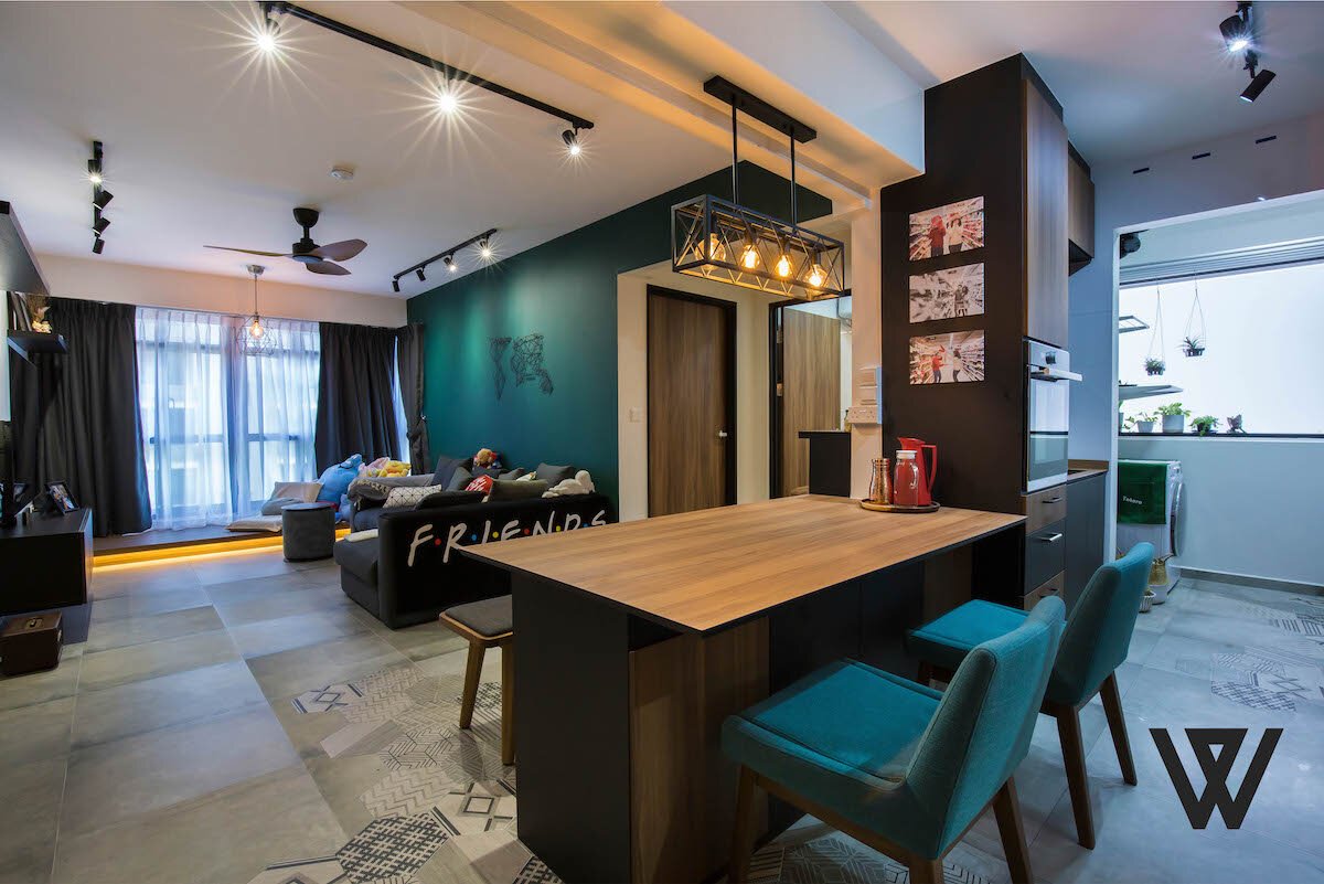 As can be seen in the following image of the HDB BTO at TECK GHEE PARKVIEW, ANG MO KIO STREET 44, the living room has been designed minimalistically with very less furniture and limited decorative elements. However, to add a fun element to this HDB BTO interior design, a complete wall of the living room has been transformed into an accent wall by painting it in a bright, blue colour. The dark brown wooden flooring compliments the accent wall and the various modern lighting fixtures and recessed lighting underneath the wooden platform further adds a touch of element and grace to this minimalist interior design.